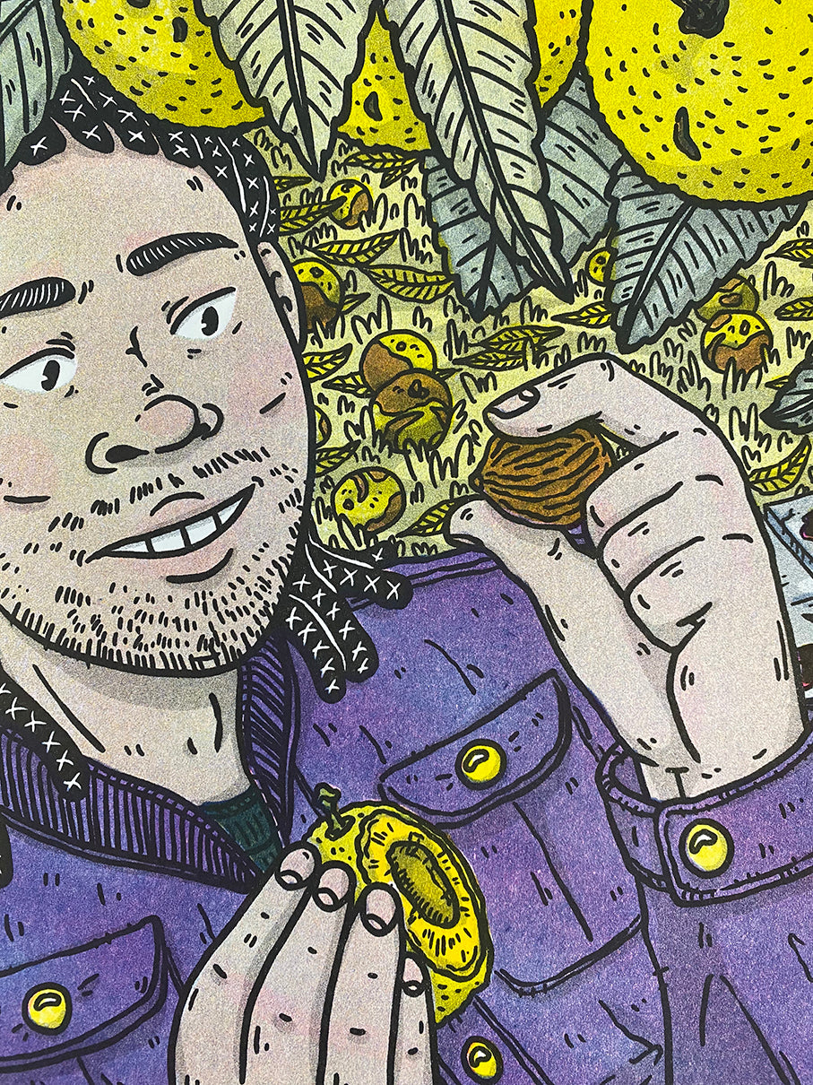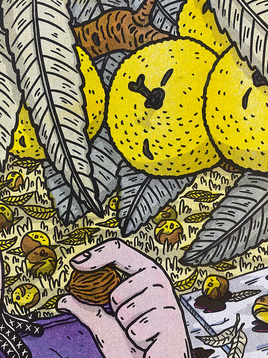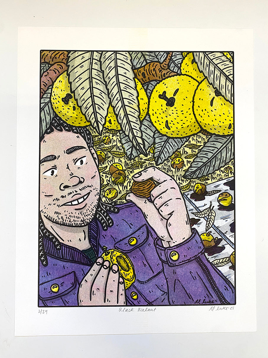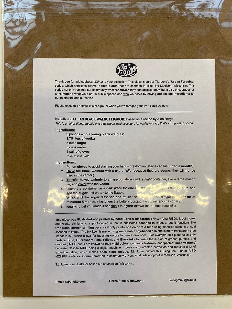 Thank you for adding Black Walnut to your collection! This piece is part of T.L. Luke’s “Urban Foraging” series, which highlights native, edible plants that are common in cities like Madison, Wisconsin. This series not only reminds our community what resources they can access today, but it also encourages us to reimagine what we plant in public spaces and who we serve by having accessible ingredients for our neighbors and ourselves.