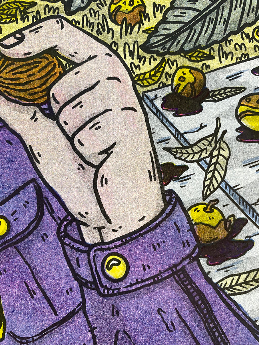 This piece was illustrated and printed by hand using a Risograph printer (aka RISO). It both looks and works similarly to a photocopier in that it duplicates scanned-in images, but it functions like traditional screen printing because it only prints one color at a time using stenciled screens of said scanned-in image. The ink itself is made using sustainable soy-based oils and is more transparent than standard ink, which allows for layering colors to create new ones. (For example, this piece uses only Federal Blue, Fluorescent Pink, Yellow, and Black inks to create the illusion of greens, purples, and oranges!) RISO prints are known for their vivid colors, gorgeous textures, and ‘perfect imperfections’ because, despite RISO being a digital machine, it does not guarantee perfection and requires a lot of experimentation, which makes each piece unique. T.L. Luke printed this using the 2-drum RISO MZ790U printers at Communication, a community-driven, local, arts nonprofit in Madison, Wisconsin.
