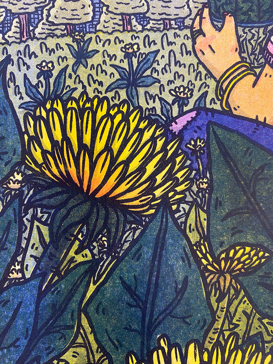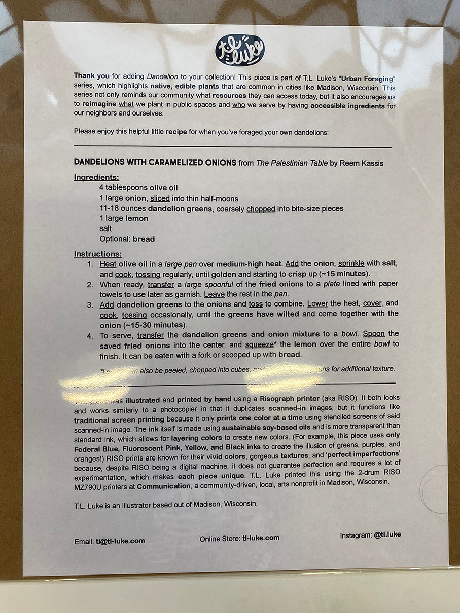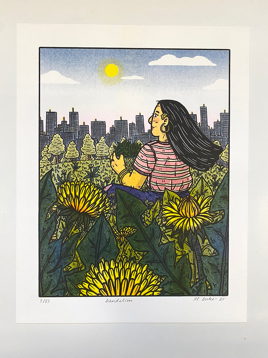 Thank you for adding Dandelion to your collection! This piece is part of T.L. Luke’s “Urban Foraging” series, which highlights native, edible plants that are common in cities like Madison, Wisconsin. This series not only reminds our community what resources they can access today, but it also encourages us to reimagine what we plant in public spaces and who we serve by having accessible ingredients for our neighbors and ourselves.