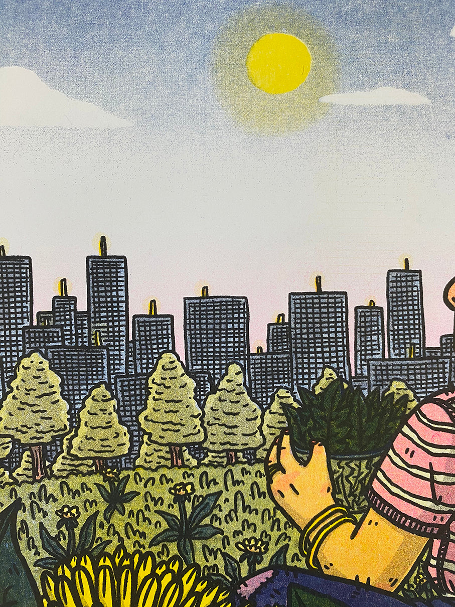 This piece was illustrated and printed by hand using a Risograph printer (aka RISO). It both looks and works similarly to a photocopier in that it duplicates scanned-in images, but it functions like traditional screen printing because it only prints one color at a time using stenciled screens of said scanned-in image. The ink itself is made using sustainable soy-based oils and is more transparent than standard ink, which allows for layering colors to create new ones. (For example, this piece uses only Federal Blue, Fluorescent Pink, Yellow, and Black inks to create the illusion of greens, purples, and oranges!) RISO prints are known for their vivid colors, gorgeous textures, and ‘perfect imperfections’ because, despite RISO being a digital machine, it does not guarantee perfection and requires a lot of experimentation, which makes each piece unique. T.L. Luke printed this using the 2-drum RISO MZ790U printers at Communication, a community-driven, local, arts nonprofit in Madison, Wisconsin.