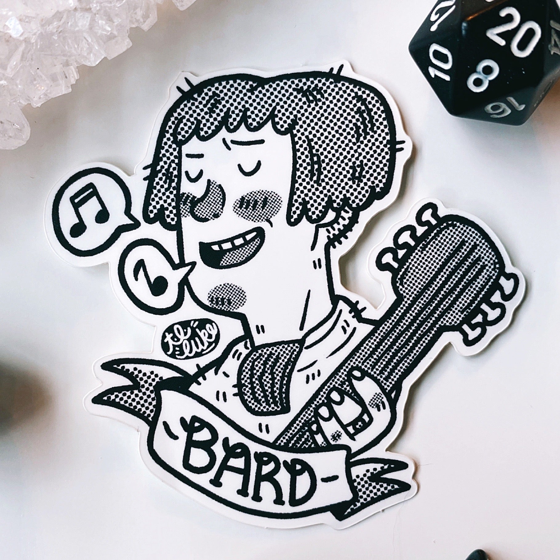 Bust of a white androgynous person with short light hair in a bob style, wearing a blouse, holding the neck of a guitar, and singing with two small word bubbles with musical notes within. There is a tattoo-style banner at the bottom that says "-BARD-".