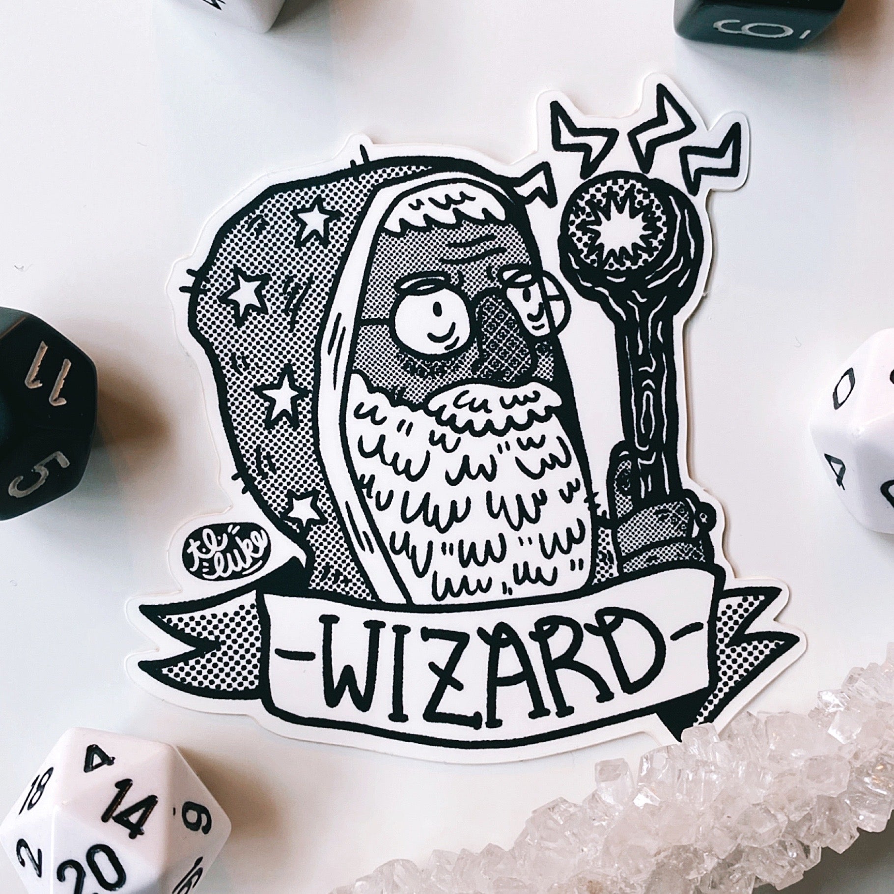 Bust of a Black, old masculine person, big white beard and white hair, big round glasses, grey cloak with white stars, hood up, in their left hand is a black wooden staff with a sparking orb, and there is a ring on their finger. There is a tattoo-style banner at the bottom that says "-WIZARD-".