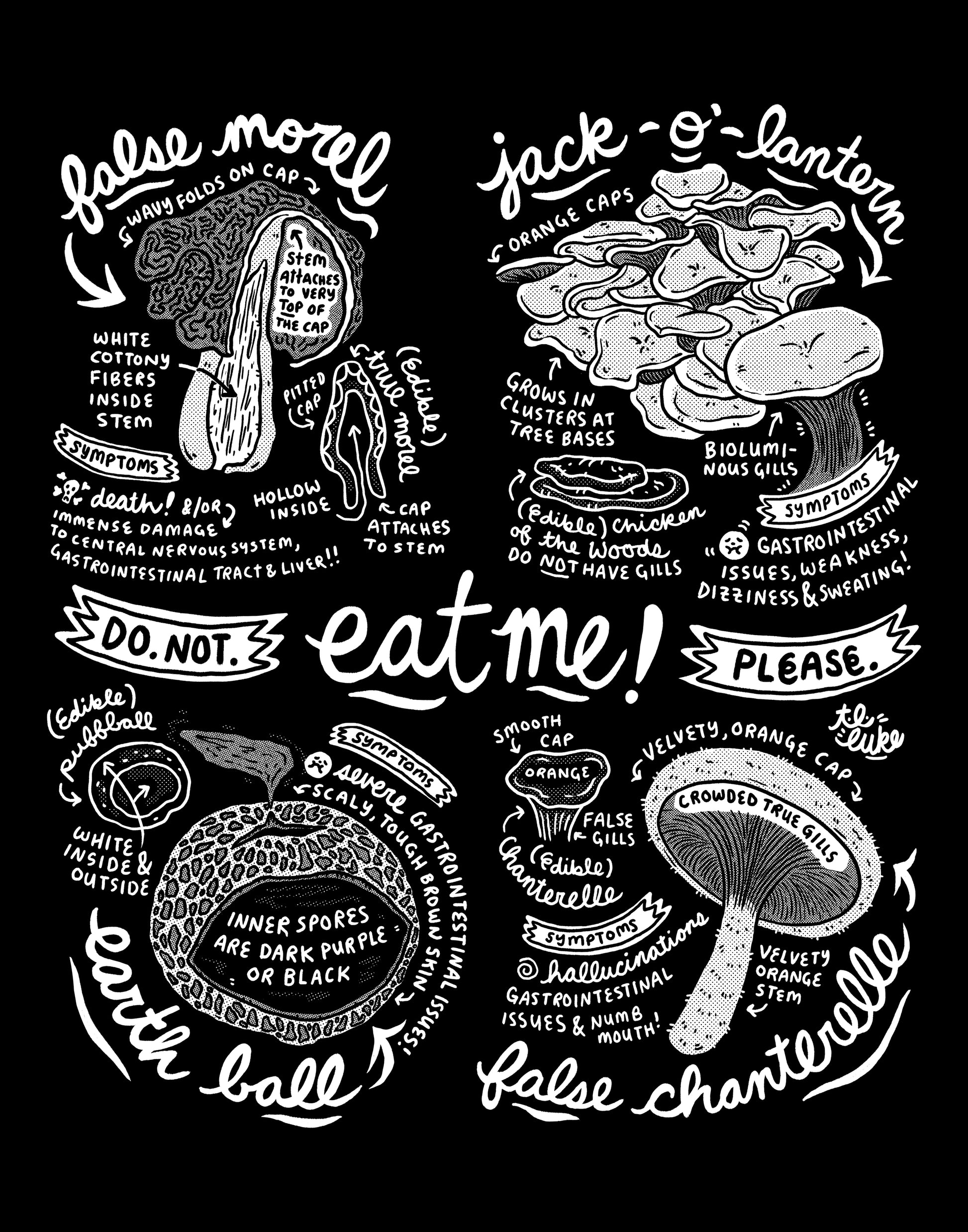 Let me help you identify some poisonous mushrooms! False morels look like their true morel counterpart, but could kill you! The toxic Jack-o'-lantern mushrooms group under trees similar to the yummy Chicken of the Woods mushrooms, and are also mistaken for Chanterelles! Chanterelle's other doppelgänger is the False Chanterelle, which can cause hallucinations! And lastly, disgusting Earth Ball mushrooms look like the delicious Puffball mushroom! Also check out our shirts and tanks!