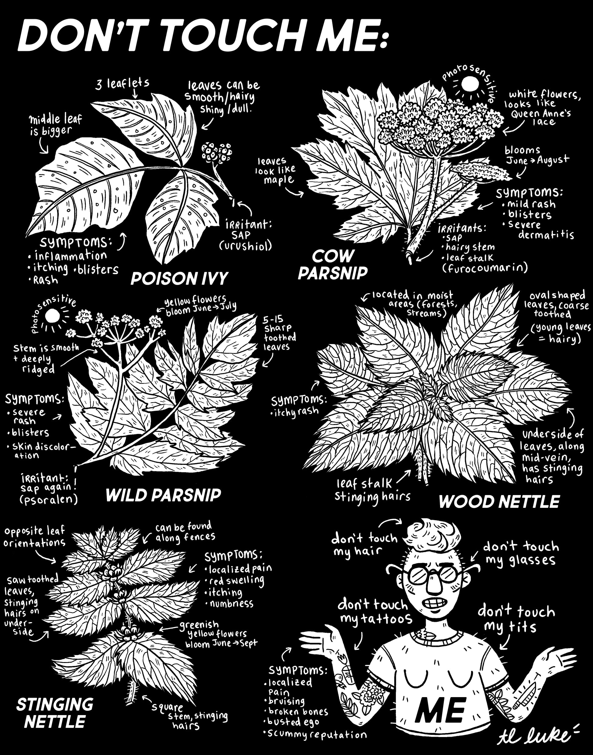 Front says "Don't Touch Me" and back has Wisconsin-native poisonous plants and how to identify them (+ one bonus personal boundaries lesson)!