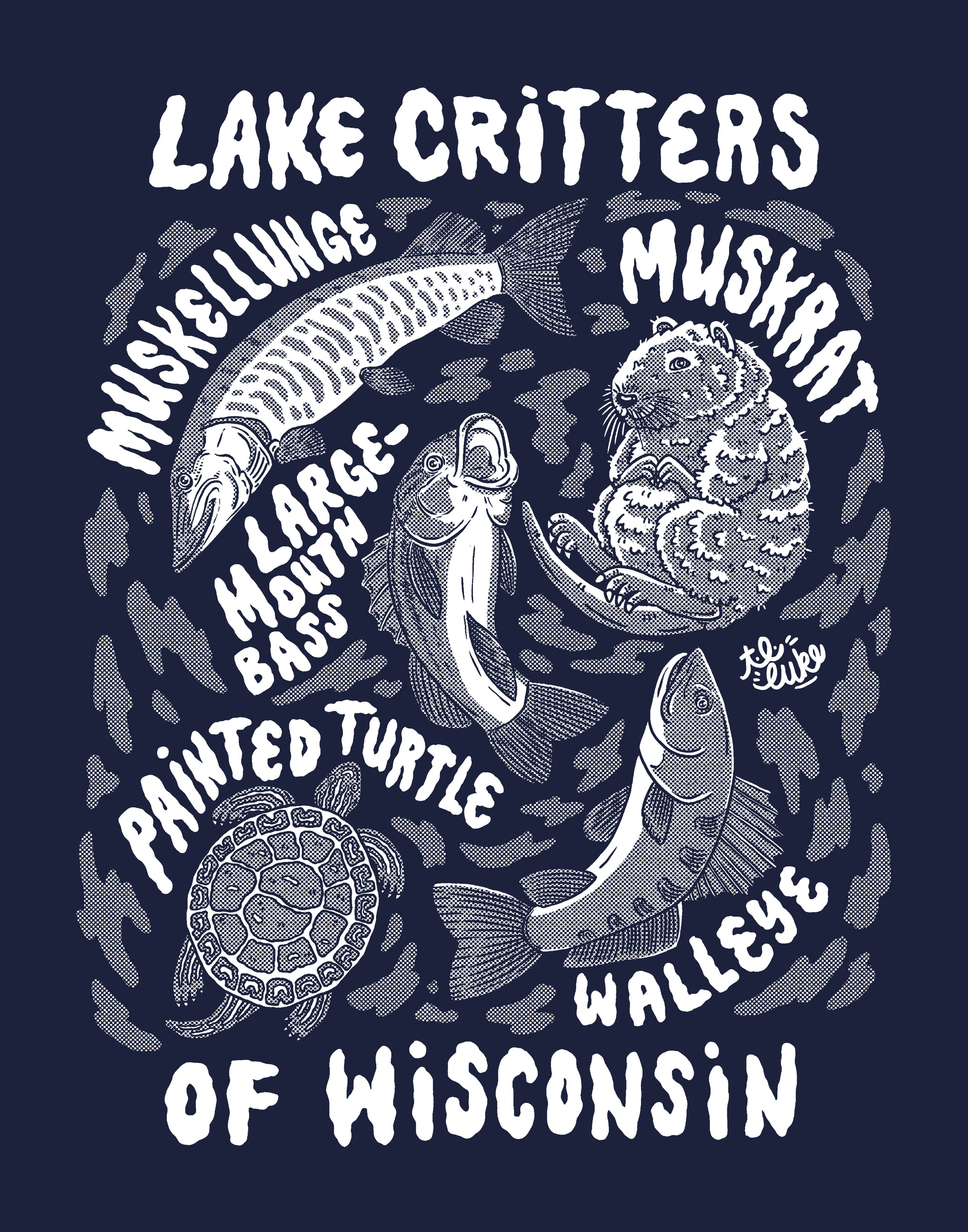 Love to fish? Trying to identify some critters in your favorite Wisconsin lakes? Here are five to help get you started: Muskellunge (Musky!), Muskrat, Largemouth Bass, Painted Turtle, and Walleye! Check out our shirts too!