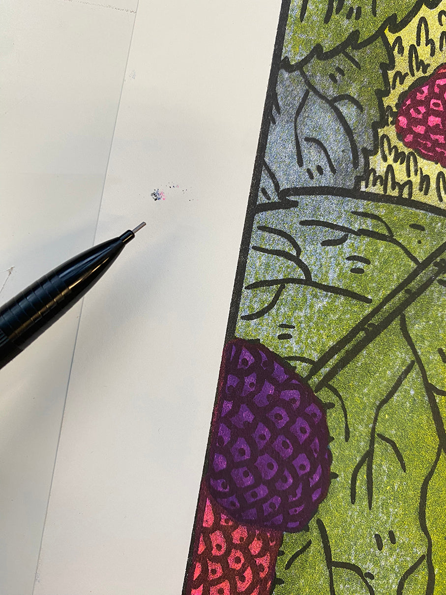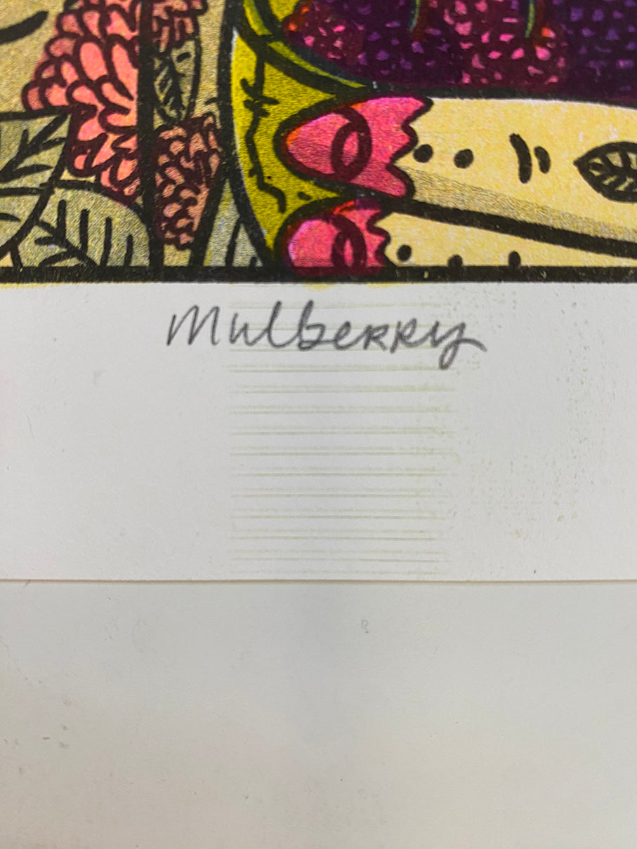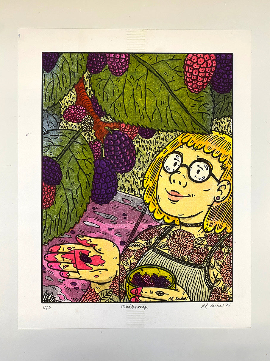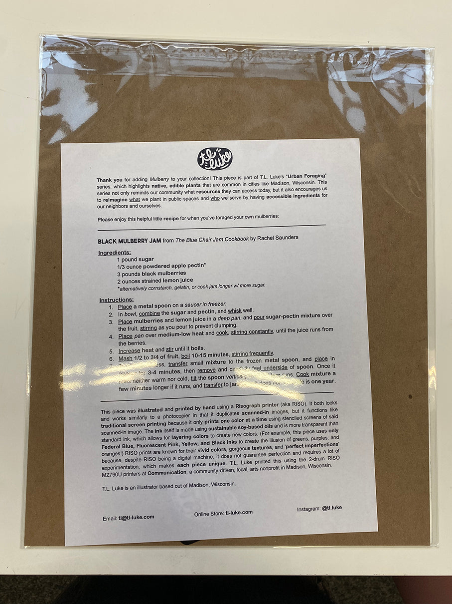 Thank you for adding Mulberry to your collection! This piece is part of T.L. Luke’s “Urban Foraging” series, which highlights native, edible plants that are common in cities like Madison, Wisconsin. This series not only reminds our community what resources they can access today, but it also encourages us to reimagine what we plant in public spaces and who we serve by having accessible ingredients for our neighbors and ourselves.