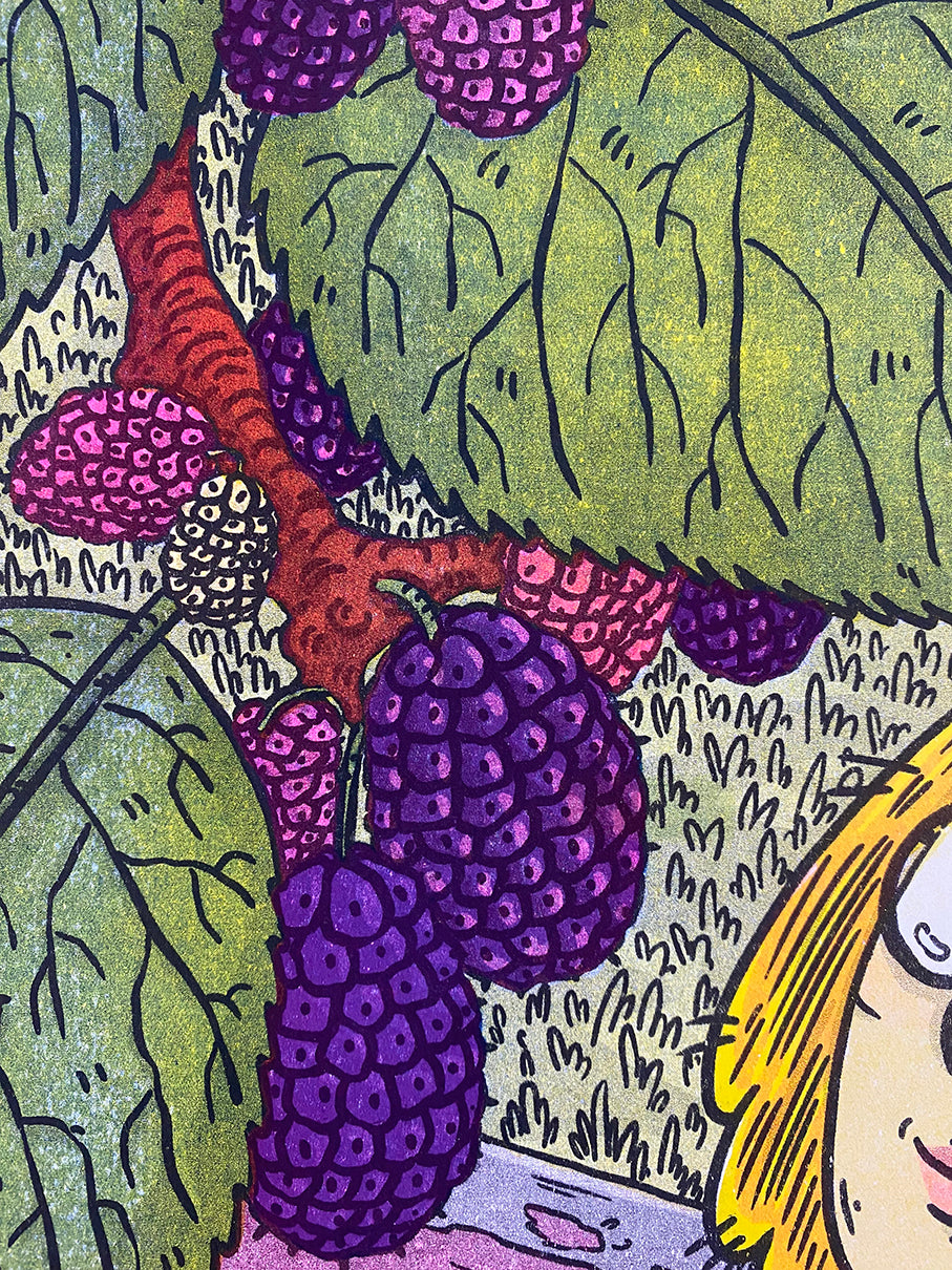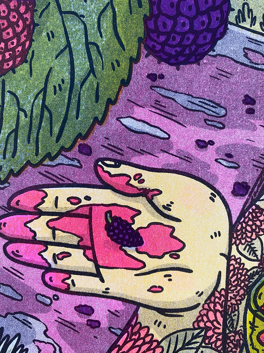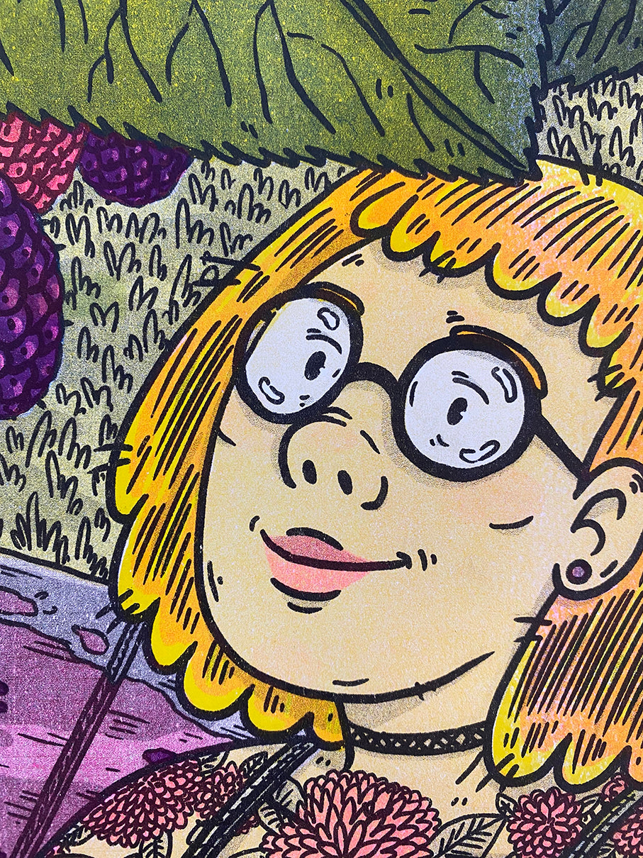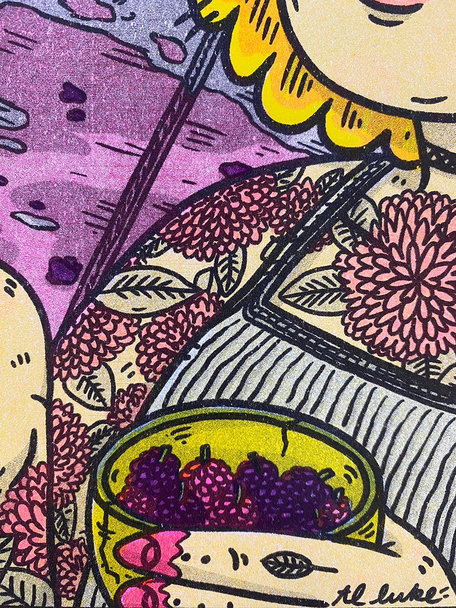 This piece was illustrated and printed by hand using a Risograph printer (aka RISO). It both looks and works similarly to a photocopier in that it duplicates scanned-in images, but it functions like traditional screen printing because it only prints one color at a time using stenciled screens of said scanned-in image. The ink itself is made using sustainable soy-based oils and is more transparent than standard ink, which allows for layering colors to create new ones. (For example, this piece uses only Federal Blue, Fluorescent Pink, Yellow, and Black inks to create the illusion of greens, purples, and oranges!) RISO prints are known for their vivid colors, gorgeous textures, and ‘perfect imperfections’ because, despite RISO being a digital machine, it does not guarantee perfection and requires a lot of experimentation, which makes each piece unique. T.L. Luke printed this using the 2-drum RISO MZ790U printers at Communication, a community-driven, local, arts nonprofit in Madison, Wisconsin.