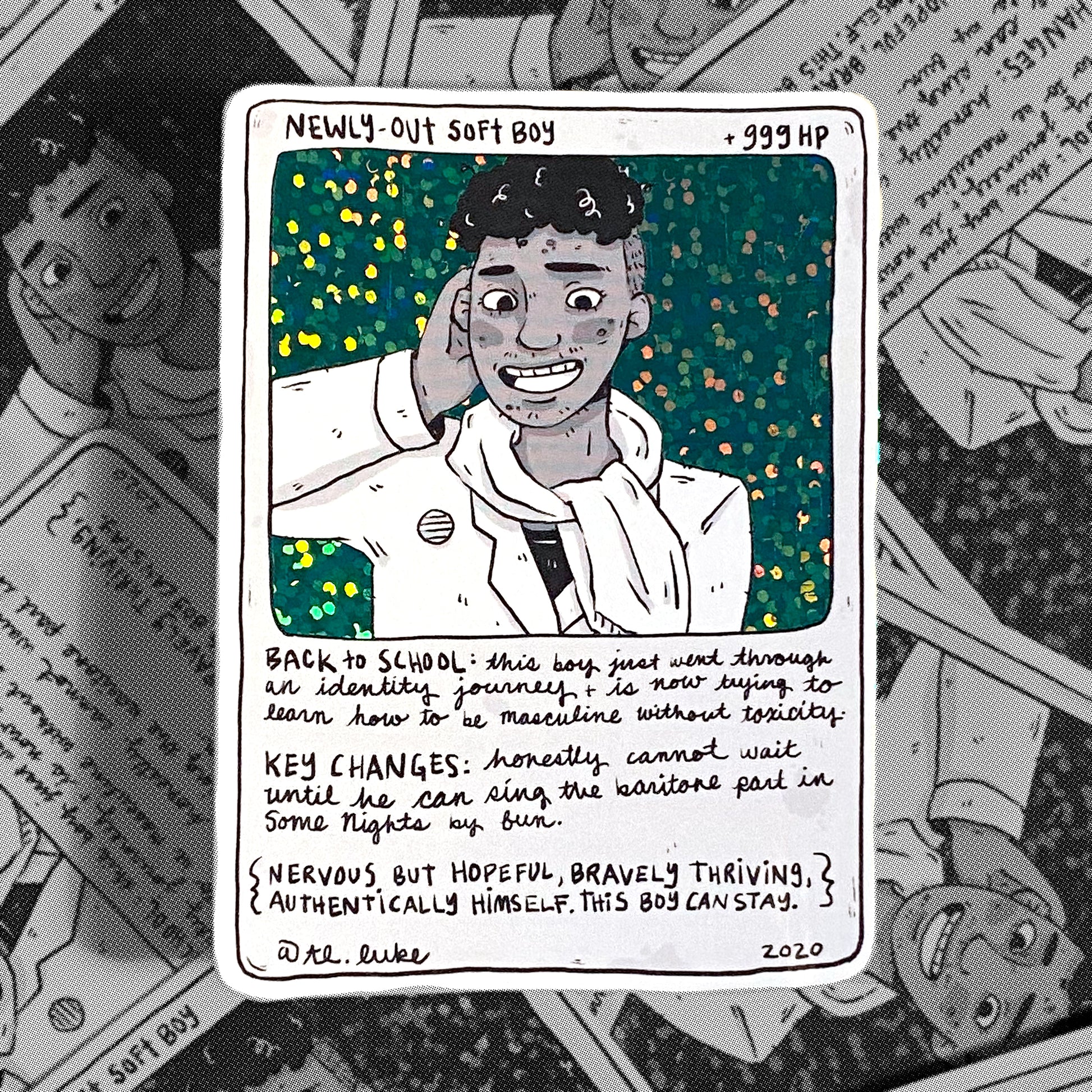 I started drawing these lil' trading card inspired illustrations to show my gratitude to the boys in my life who are very soft and trying their best to distance themselves from toxic masculinity. It is a HARD THING TO DO, especially when being toxic is still pretty rewarding in our society (but less so~~~ and changing~~~).