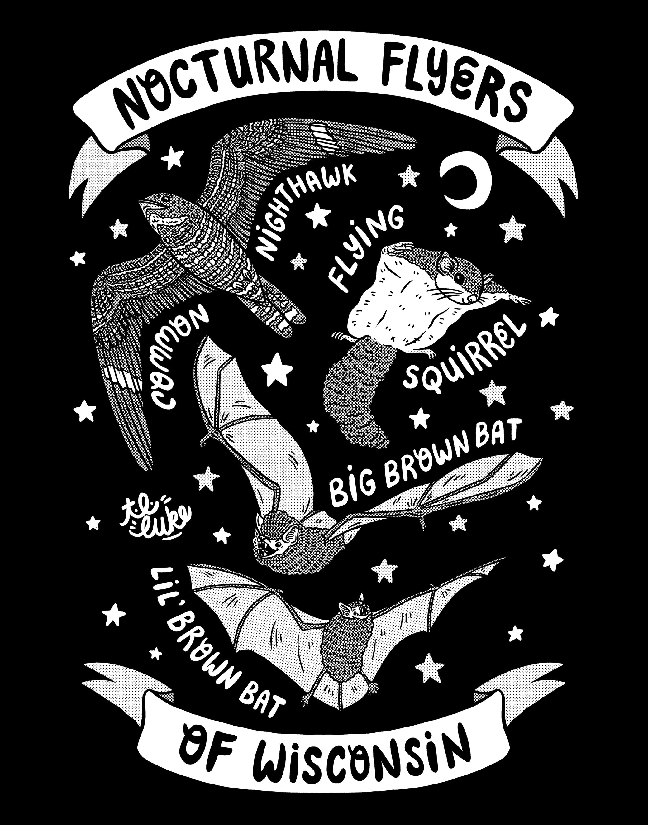 Walking around Wisconsin at night and see something swoop through the night sky? It might be one of these cute nocturnal flyers: Common Nighthawk, Flying Squirrel (It's true!!), Big Brown Bat, and Little Brown Bat (different species of bat!!) Check out our shirts too!