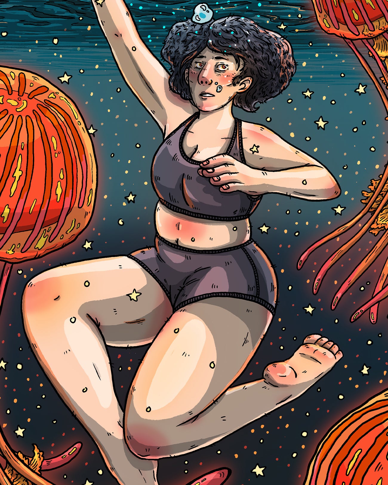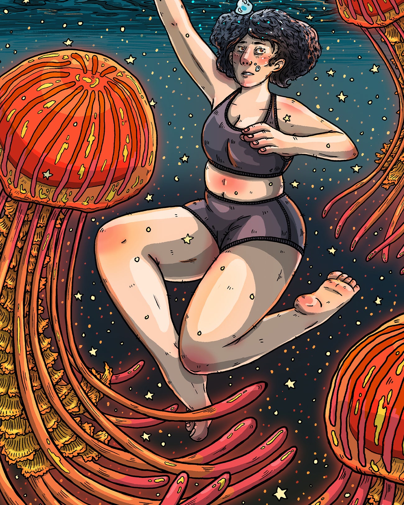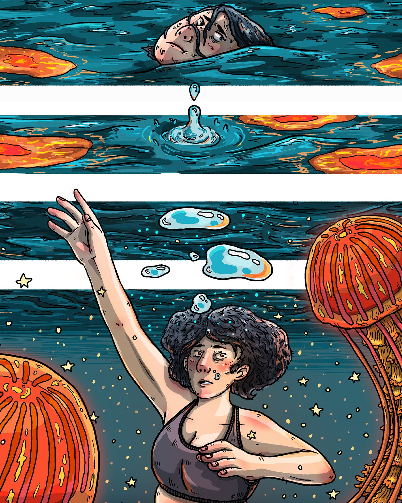 Inspired by the exhaustion of treading in rough waters and the relief of letting go, The Beauty of Drowning invites the viewer to sink deeper with the main character and ask, "What are you actually afraid of?" During storms, often it is calmer and more manageable below the waves than trying to fight the surface's chaos. What are we missing by fighting the currents? Are we providing a disservice to ourselves by panicking about the unknown?
