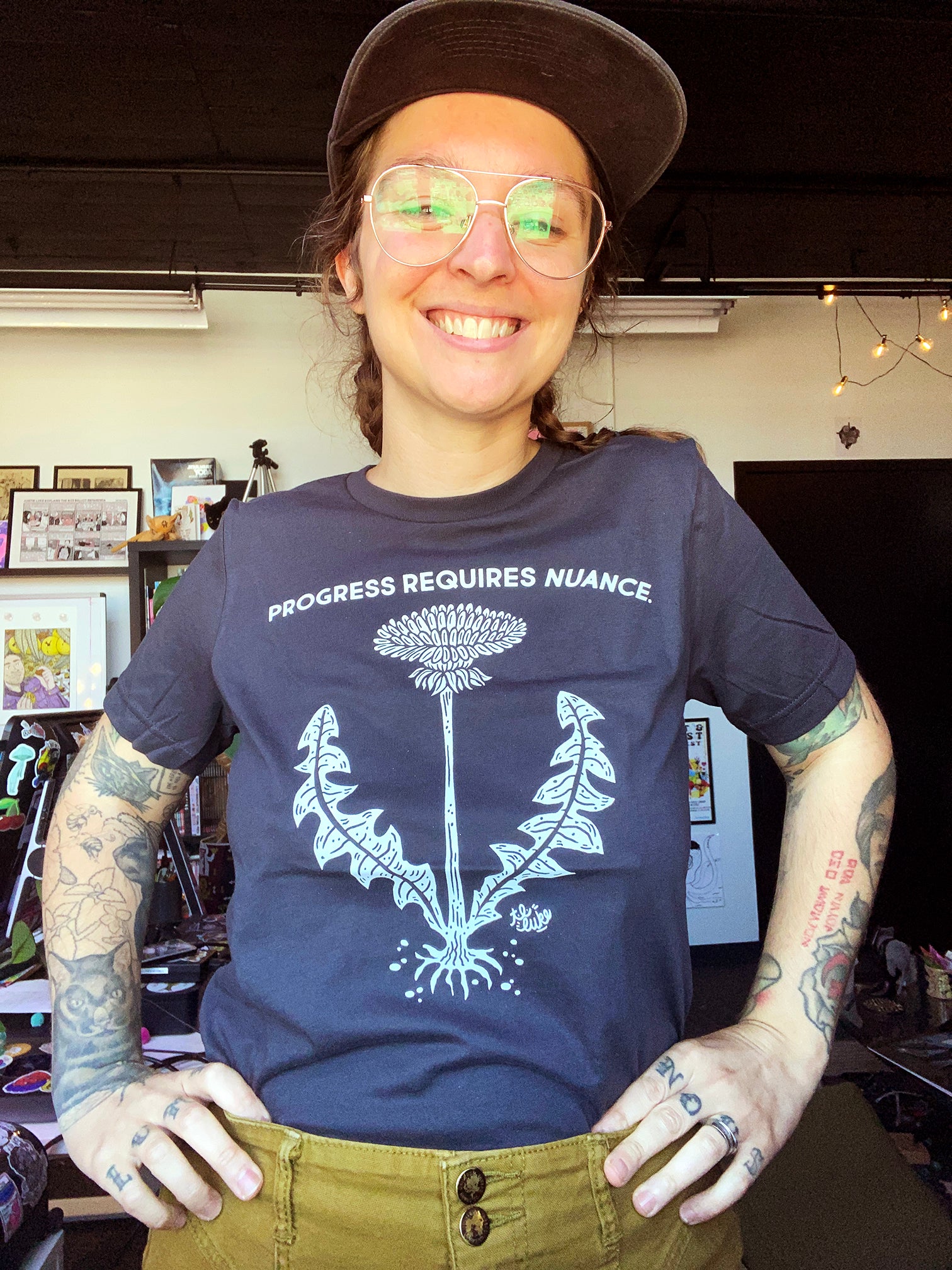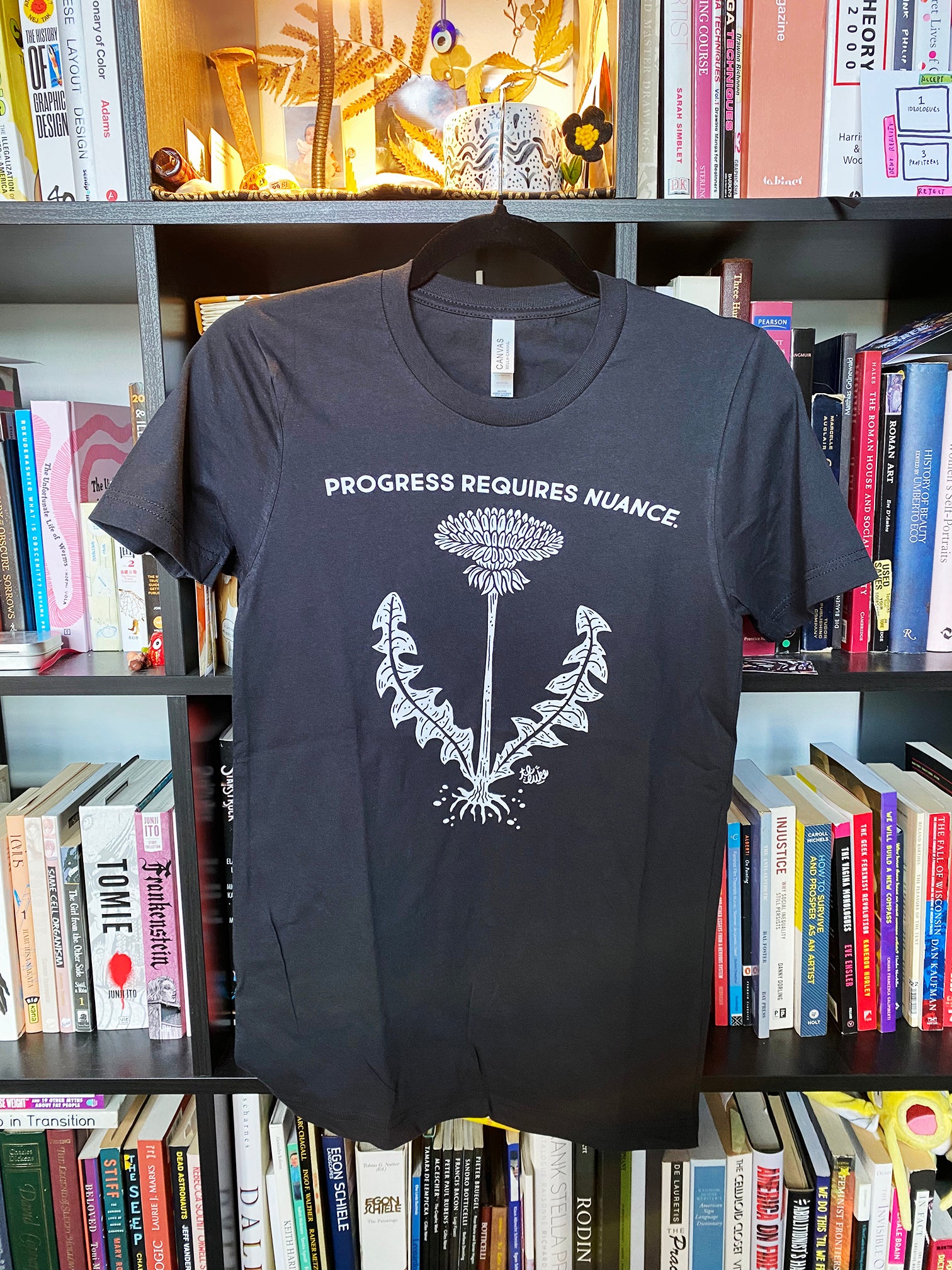 Front says "Progress Requires Nuance." with an illustrated dandelion, a natural example of nuance in our society, as some consider dandelions weeds while others use them medicinally!