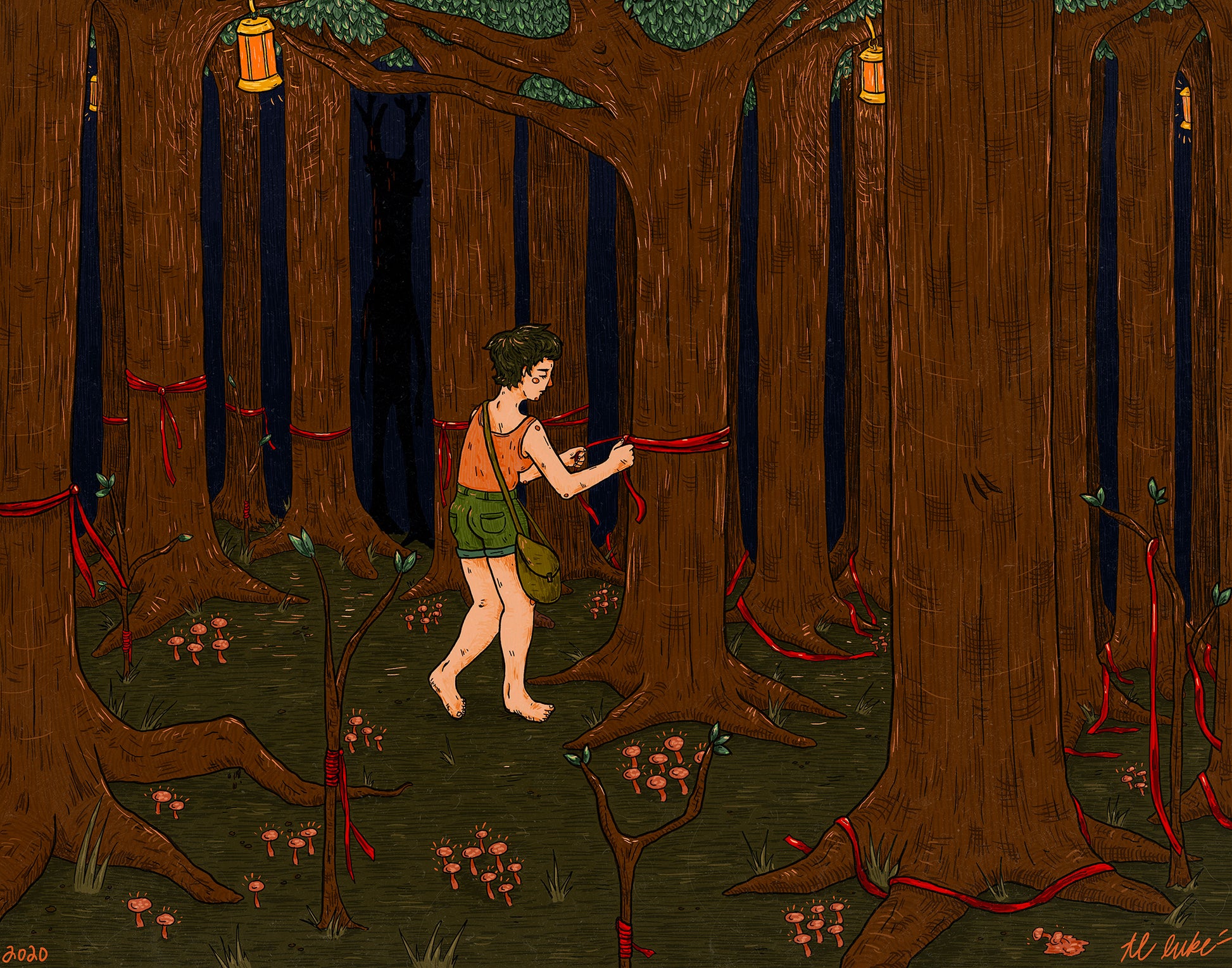 But...sometimes depression can be very inviting and very beautiful, in its own ways. The dark forest is, after all, very familiar. Sometimes tying ribbons is easier than the things we should be doing. That's the bittersweetness that I wanted to capture in this illustration. It's ok to tie ribbons sometimes, but don't lose yourself in it forever.